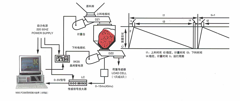 上料電振機和稱量斗是軟連結的,重力分離,下料電振機雖也是軟連結,但其重力和稱量斗整體由三只拉力傳感器支撐的,由稱量斗內料柱連結。工作時首先由上料電振機向稱量斗給料,當達到料倉給定重量的給定上限值時,停止給料。間隔一段時間后,下料電振機開始卸料,當卸料至給定的重量下限值時,停止卸料;如此重復動作。物料的流量計量是由料倉內失去的物料重量多少來確定,因此叫失重定量給料機。